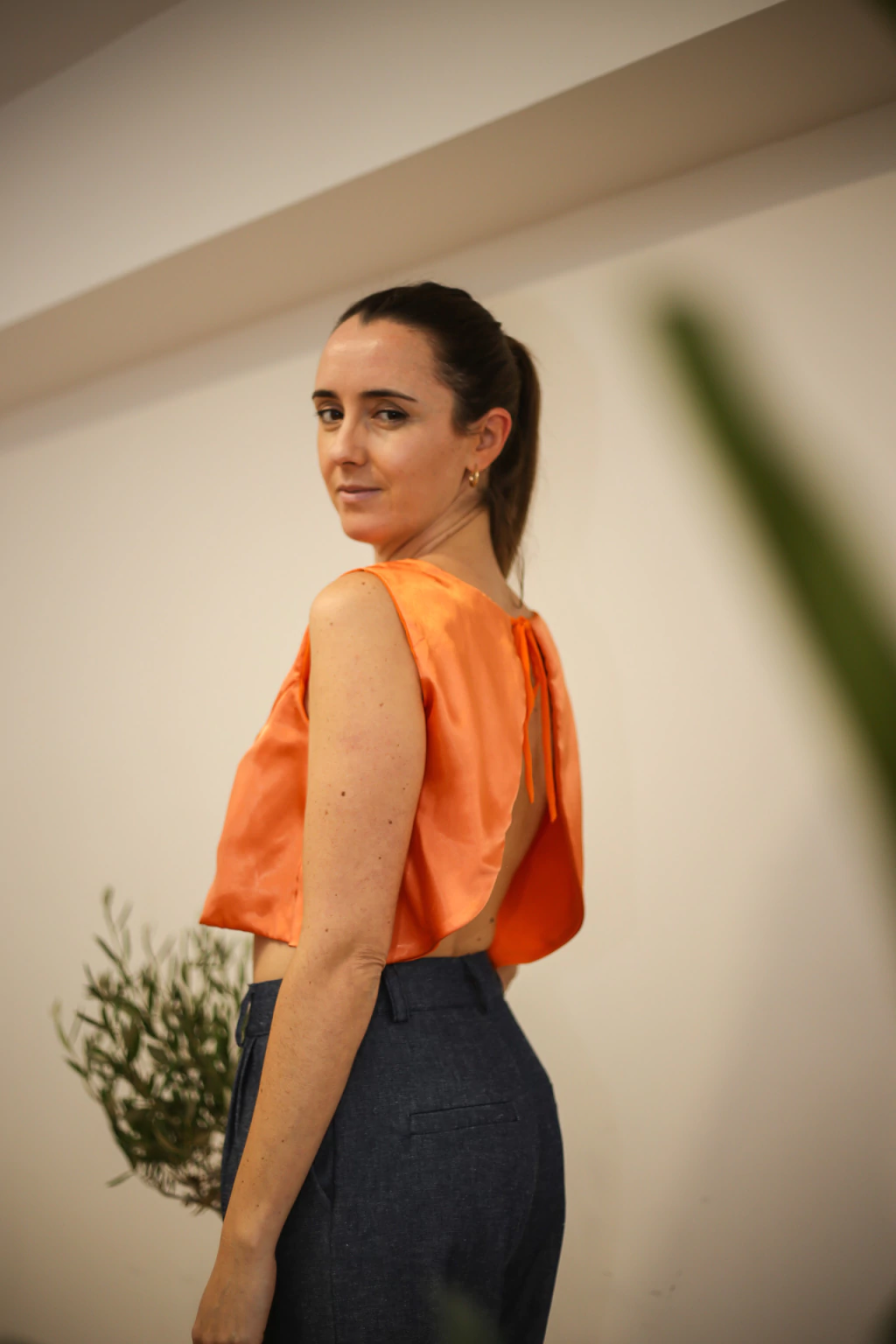 La Blusa Indi, una musculosa de vestir en gasa y satén. Es reversible, para usarla del lado opaco o brilloso. Digamos que tenés dos música en 1.