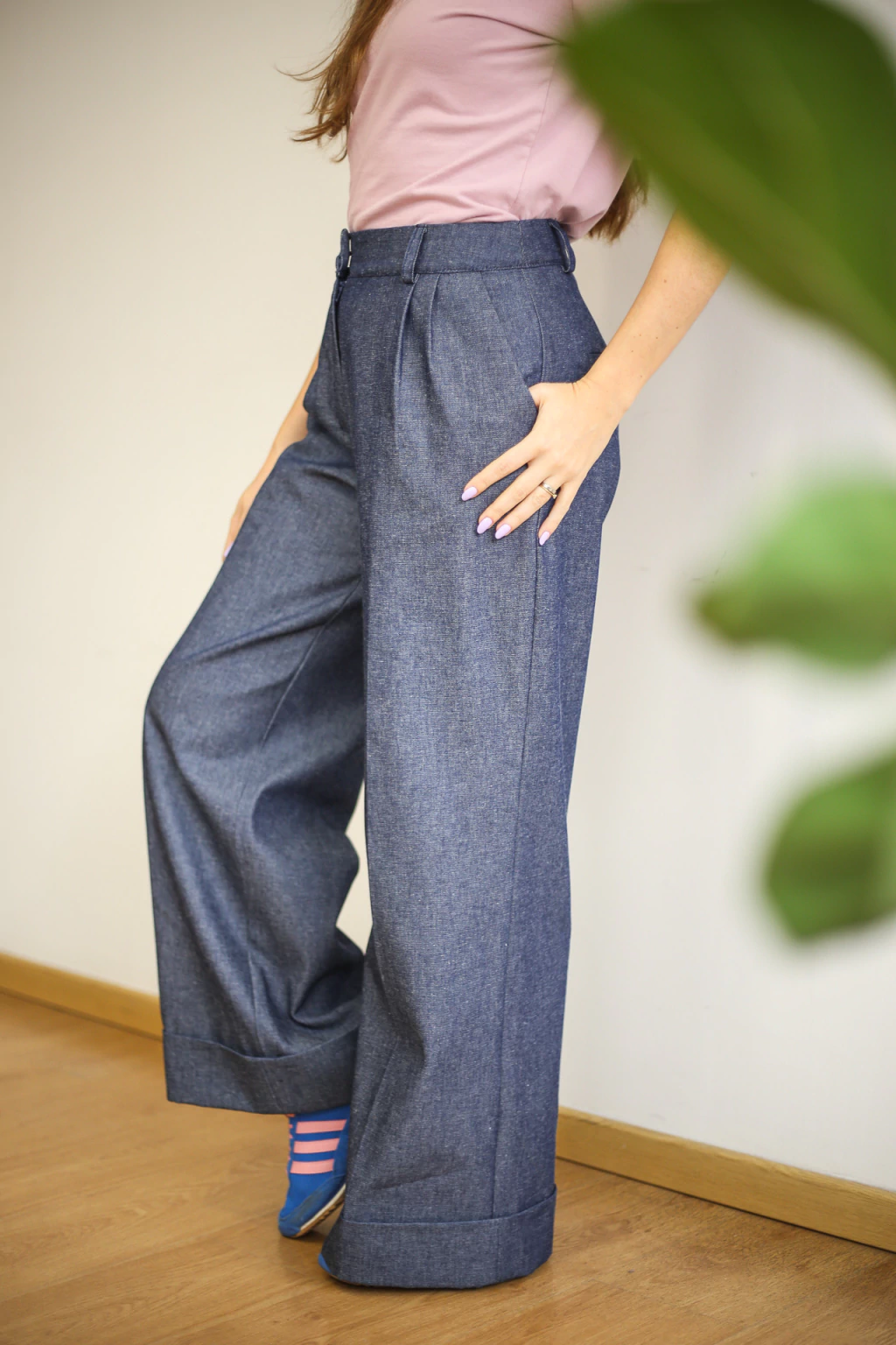 Pantalón palazo confeccionado en tela de jean camisero, cómodo suave y atemporal.